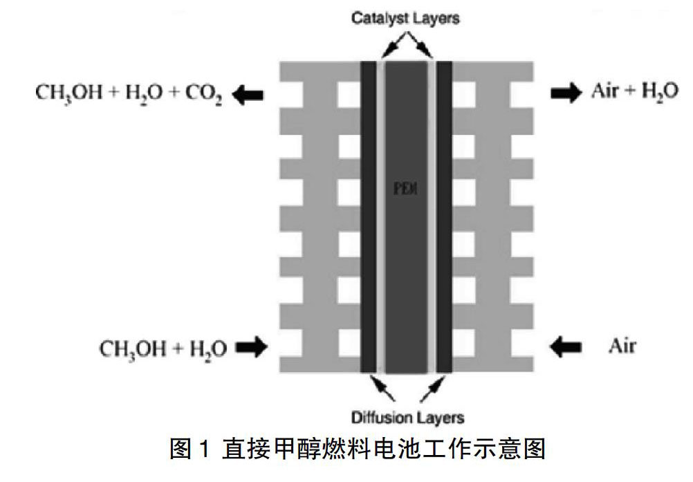 图1为直接甲醇燃料电池的基本结构示意图。当两个电极通过外电路连接起来时,甲醇在阳极被氧化成CO2,1mol甲醇分子可释放出6mol氢质子和6mol电子,电子经由外电路到达阴极,最终再经内电路渗透到阴极的氢质子和经外电路传导至阴极的电子及氧气复合生成H2O。阳极释放的电子在流经外电路时可对外做功。